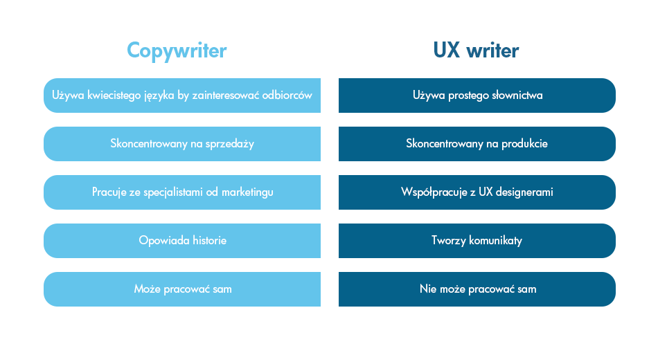 Różnica między UX writingiem a copywritingiem, czy content writingiem, jest naprawdę znacząca. UX writer współpracuje z UX designerem, tworząc treści pod makiety i wytyczne, które poprzedzone są badaniami. UX writing skupia się przede wszystkim na prostych komunikatach, które znajdą się w aplikacji mobilnej, czy na danych stronach. UX writerzy koncentrują się więc na tym, by odbiorcy nie mieli problemów z nawigacją po podstronach oraz ze zrozumieniem czynności do wykonania. Treści projektowane pod kątem UX, są dopasowane do oczekiwań użytkowników i pomagają im zrozumieć to, w jaki sposób działają określone rozwiązania na stronie. Dlatego taka praca polega przede wszystkim na upraszczaniu języka i zwiększaniu użyteczności.