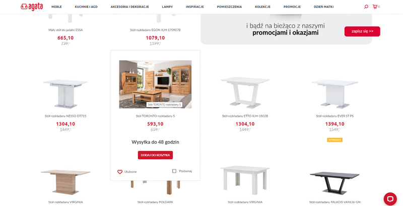 Po kliknięciu specjalnego przycisku użytkownikowi wyświetlają się inne podobne meble np. stoły do tego aktualnie przeglądanego.