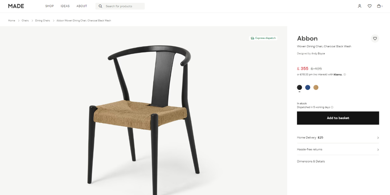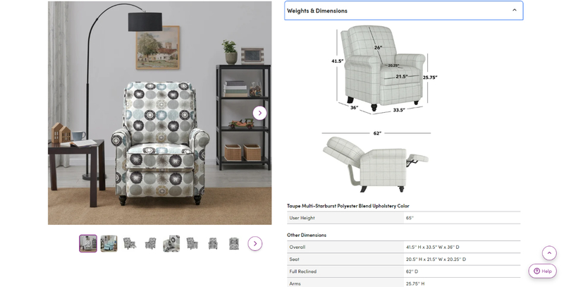 Poniżej przykład z jednego z meblowych e-commerce z fotelem. Wymiary naniesione na zdjęcie są zrozumiałe i nie będą powodować problemów z ich zrozumieniem. Poniżej zamieszczono także tabelę, w której podano wymiary w formie pomocniczej. Gdyby jednak tabela była jednym źródłem informacji, sytuacja z perspektywy użyteczności byłaby zdecydowanie gorsza.