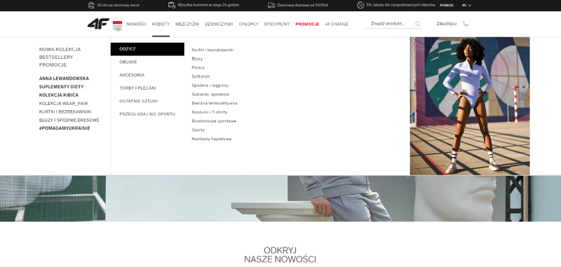 Marka 4F stawia na przejrzysty design i intuicyjną nawigację w zakresie organizacji menu na stronie głównej. Wykorzystując obrazy w menu, dodatkowo ilustruje kategorię, co pozytywnie wpływa na wrażenia konsumenckie. Bezproblemowa nawigacja do prosto zdefiniowanych kategorii jest kluczem do doskonałego doświadczenia użytkownika.