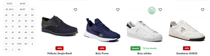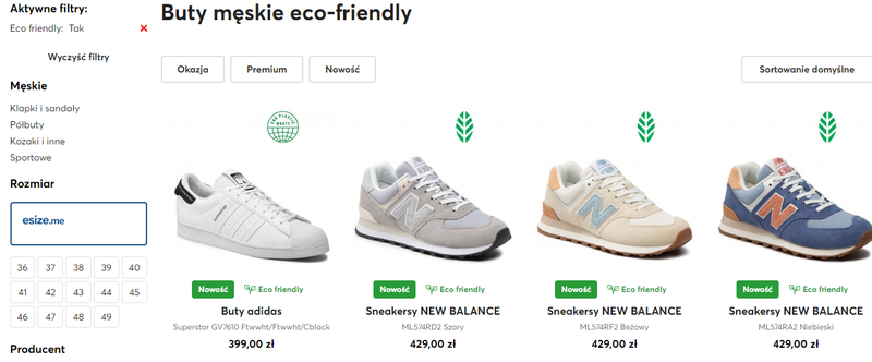 W przypadku sklepu e-obuwie, informowanie użytkowników nie zostało ograniczone jedynie do oznaczania konkretnych produktów specjalnym hasłem „eco-friendly”. Serwis daje użytkownikom także możliwość filtrowania oferty pod kątem ekologiczności produktów.