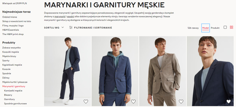Sklep www2.hm.com na stronach kategorii, oprócz rozbudowanych opcji filtrowania asortymentu, oferuje unikalną funkcję polegającą na możliwości obejrzenia zdjęć produktu na modelu lub samego produktu. Prosta, lecz niesłychanie ciekawa opcja, gdyż z reguły sklepy online serwują użytkownikom aranżowane zdjęcia z udziałem modela/modelki. Zdjęcie samego produktu pojawia się dopiero po wejściu w kartę produktu, lecz przeglądający może też nie zobaczyć go wcale. W tym konkretnym przypadku już na stronie kategorii można zobaczyć produkt zarówno w wersji aranżowanej jak i saute.