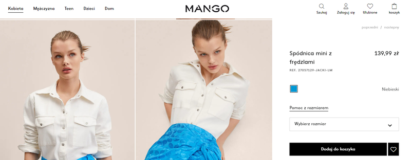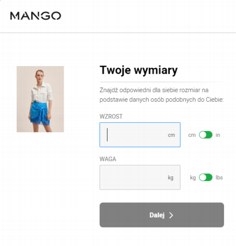 Na karcie produktu w Mango znajduje się przycisk „pomoc z rozmiarem”, po którego wciśnięciu użytkownikowi ukazuje się POP UP, gdzie ma on do uzupełnienia szereg informacji, takich jak wzrost, waga, kształt brzucha, bioder oraz preferencje dotyczące dopasowania odzieży do ciała. Cała ta procedura ma na celu jak najlepsze dopasowanie rozmiarów odzieży do faktycznych wymiarów i preferencji kupującego. Przeprowadzone testy tego rozwiązania pokazały, że to naprawdę działa. Jedna uwaga – przy wypełnianiu formularza nie oszukujemy.