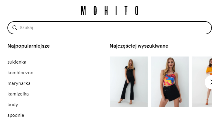 Po kliknięciu w obszar wyszukiwania, użytkownik otrzymuje możliwość szybkiego przejścia do najpopularniejszych kategorii produktowych oraz najczęściej wyszukiwanych produktów.