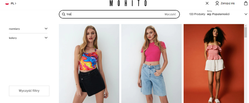 Po wpisaniu konkretnej frazy, już na etapie wyszukiwania, sklep umożliwia filtrowanie produktów po kolorze i rozmiarze, co znacznie ułatwia sprawdzenie dostępności interesujących użytkownika rzeczy: