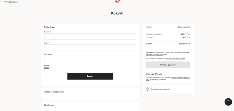 Pozostając przy sklepie H&M, warto przyjrzeć się również karcie koszyka. Gdy znajdziemy odpowiedni produkt, będący doskonałym uzupełnieniem garderoby, a wszyscy domownicy głośno krzyczą „kup to” - podejmujemy decyzję o zakupie. To właśnie wtedy trafiamy na stronę koszyka, na której finalizujemy zakup.