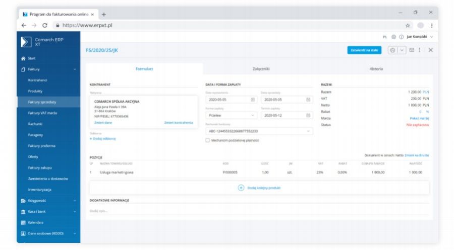 - wystawiania i wysyłania faktur do klienta bezpośrednio z systemu,