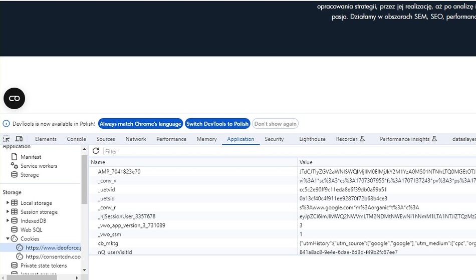- Sprawdzamy, czy pojawiły się tam jakieś ciasteczka np. narzędzi marketingowych.