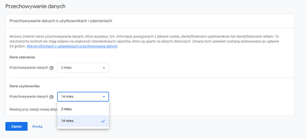W odróżnieniu od Analytics Universal - GA4 wymaga określenia okresu przechowywania danych. Domyślnie jest to okres 2 miesięcy, jednak samodzielnie możemy wydłużyć ten okres do 14 miesięcy. Najczęściej ten okres nie jest zmieniany i podczas analizy danych mamy dostępne tylko dane z ostatnich 2 miesięcy.