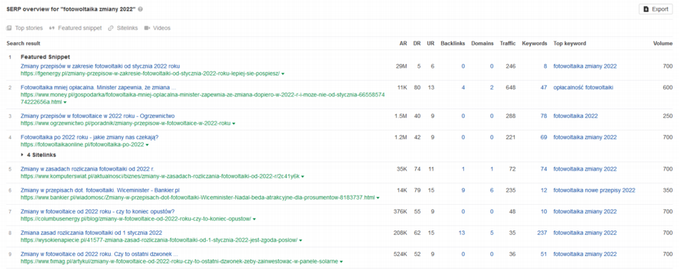Źródło:https://app.ahrefs.com/keywords-explorer/google/pl/overview?keyword=fotowoltaika%20zmiany%202022.