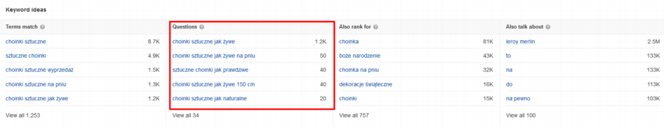 Bardzo często podczas analizy ogólnych fraz, narzędzia podpowiadają nam zestawienia słów, które nie mają gramatycznego sensu, niemniej jednak cieszą się dużą popularnością. Można je w takim wypadku zastosować tworząc posty na blogu bądź też, generując nowe zapytania w sekcji FAQ.