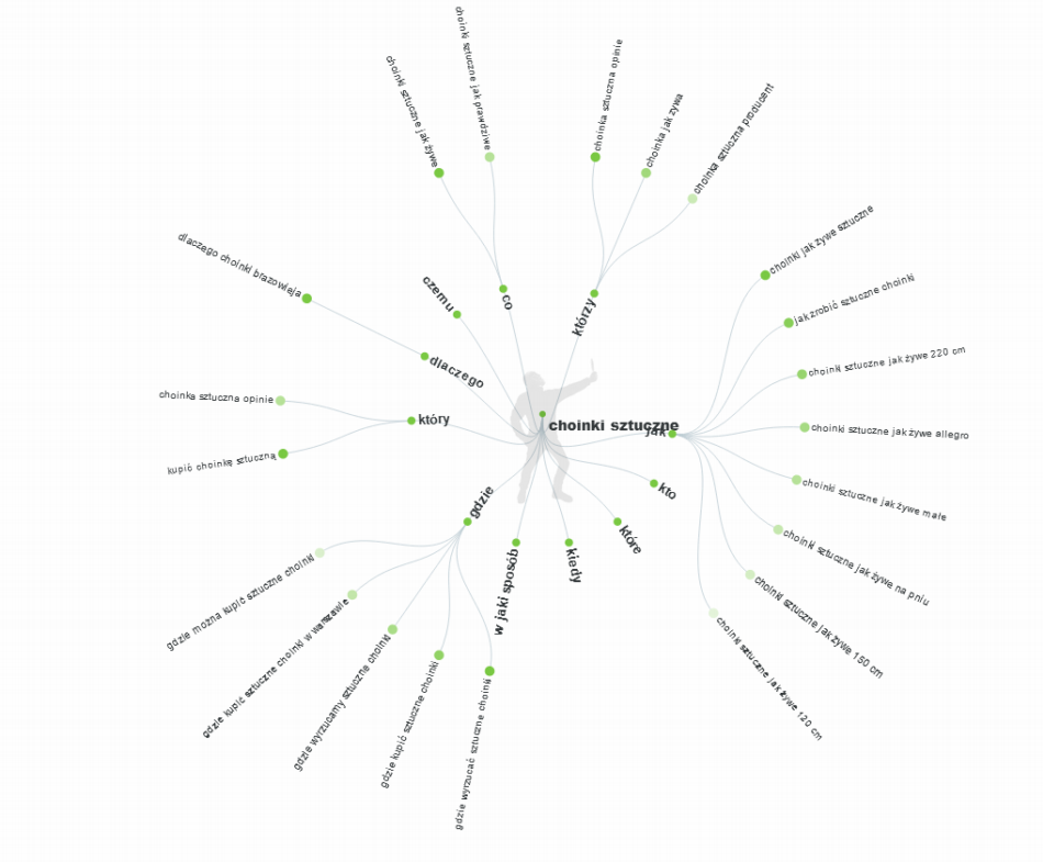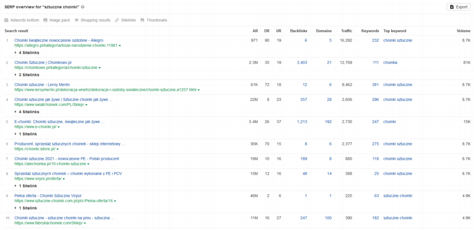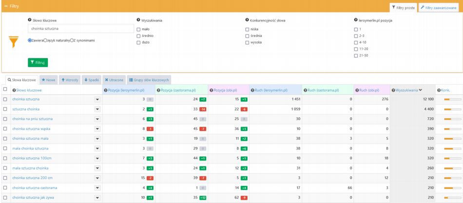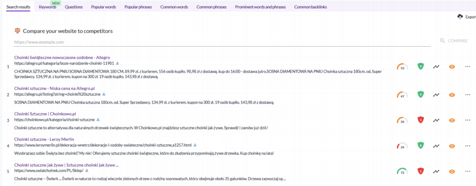 Po wykonaniu dokładniejszej analizy frazy „choinka sztuczna na pniu” zauważamy, że jeden sklep znacząco przebija się na tle konkurencji. Co więcej, otrzymujemy szereg fraz bliskoznacznych, na które warto dodatkowo zoptymalizować stronę w celu dotarcia do określonych klientów.