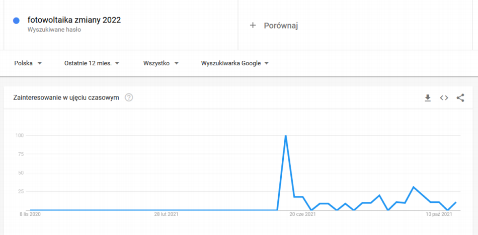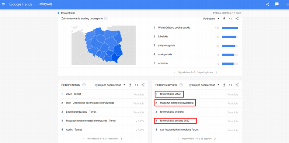 Przykład: W 2021 roku pojawiła się informacja na temat zmian w branży fotowoltaicznej od 2022 roku. Zanim jednak temat został nagłośniony na tyle, że praktycznie każdy o tym wiedział, wiele firm oferujących instalacje fotowoltaiczne nie wspominało o tym zagadnieniu. Niemniej jednak pojawili się tacy, którzy dzięki Google Trends zaczęli wprowadzać pierwsze przesłanki na stronach, takie jak wpisy blogowe, czy też odpowiedzi w sekcji FAQ.