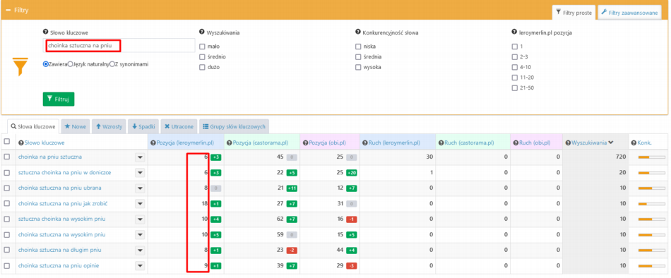 Jak można zauważyć na powyższym screenie, na frazę „choinka sztuczna”, trzy sklepy wyświetlają się na różnych pozycjach. Przy czym jeden z nich powinien dopracować swoją stronę, aby zacząć konkurować z rywalami. Co więcej, SENUTO podsuwa nam liczne propozycje fraz związanych z tematyką sztucznych choinek. Dzięki temu możemy łatwo weryfikować, który konkurent prowadzi określone działania, a który jeszcze nie. Jak można więc wnioskować, fraza „choinka sztuczna na pniu” może przynieść wartościowy ruch ponieważ generuje wyszukiwania, przez co warto przyjrzeć się dokładniej tej frazie.