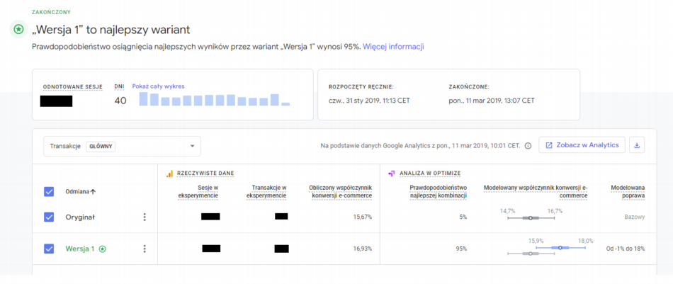 - Część „raportowa”, wykorzystująca dane z połączonego konta Google Analytics, aby zapewnić wgląd w eksperymenty, skonfigurowane za pomocą edytora.