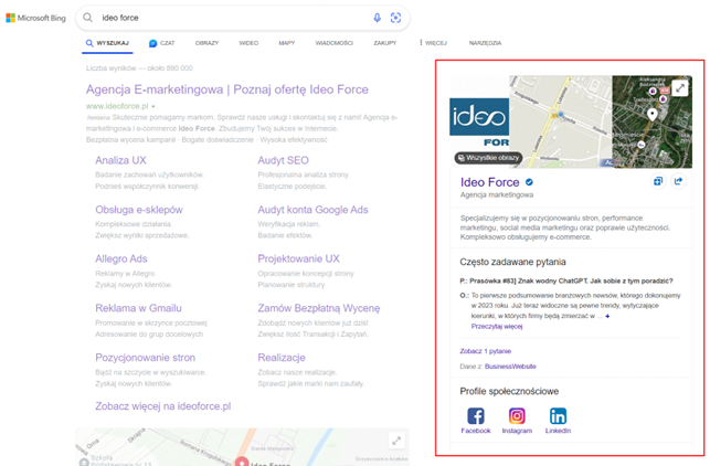 Warto również pamiętać o dodaniu zdjęć. Jedną z największych różnic między Google Business Profile a Bing Places jest wykorzystanie obrazów. Chociaż obie platformy pozwalają na dodanie zdjęć, to właśnie Bing Places przywiązuje do nich większe znaczenie. Po wpisaniu zapytania jako pierwszy wynik widzimy pasek z informacją o firmie, gdzie w tle jest duże zdjęcie. Jest to pierwsze, co zobaczy potencjalny klient, dlatego warto zadbać o dobranie zdjęć już na samym początku.