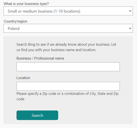 Jeśli jednak zdecydujemy się na założenie profilu bezpośrednio w Bing Places, to pierwszym krokiem będzie wybranie typu firmy i lokalizacji z menu rozwijanego.