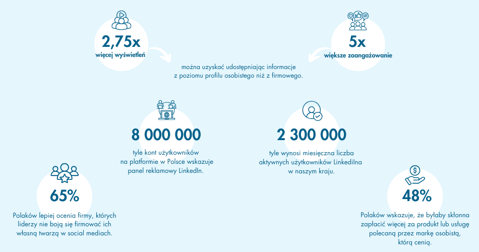 Potwierdzeniem tej tezy mogą być m.in. wyniki badań Refine Labs, które dotyczyły aktywności na LinkedInie. Wyniki te wskazały, że udostępniając informacje z poziomu profilu osobistego, można zyskać 2,75 razy więcej wyświetleń i 5 razy większe zaangażowanie niż w przypadku udostępniania ich z poziomu profilu firmowego.