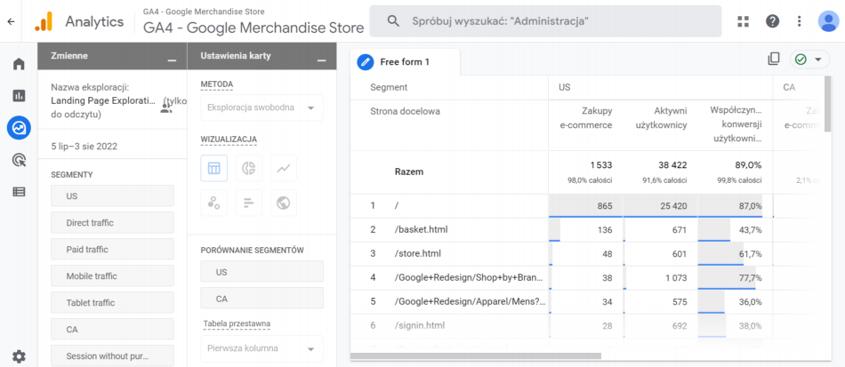 Widok przykładowego raportu stworzonego w sekcji Eksplorowanie. Dane z konta demonstracyjnego Google.