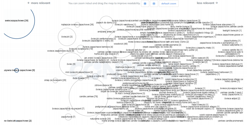 Cluster map najlepiej „czytać” od lewej strony, gdyż tam znajdują się najbardziej zbliżone tematycznie sugestie (klastry). Jeśli klaster będzie dobrze pokryty przez dana stronę, wtedy jego kolor będzie ciemniejszy. Jesteśmy w stanie sprawdzać jak to wygląda na tle konkurencji otrzymując przejrzyste wyniki, bardzo łatwe do analizy.