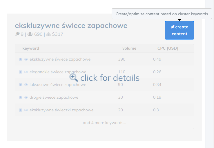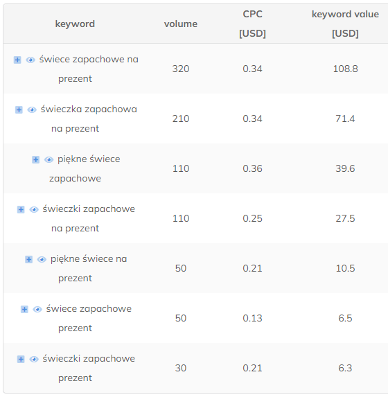 W ten sposób możemy przygotować już frazy, które będą mogły być zamieszczone w opisach kategorii, na blogu lub nawet w artykule specjalistycznym w serwisie zewnętrznym. W kilka minut możemy dzięki narzędziu opracować szybki zarys naszej strategii content marketingowej na najbliższe miesiące. Każdy klaster (podtemat) może osobno analizować.