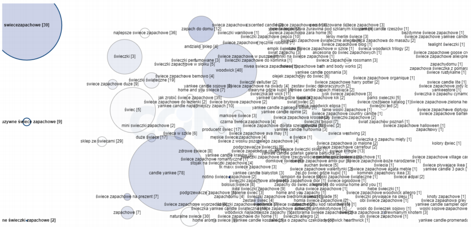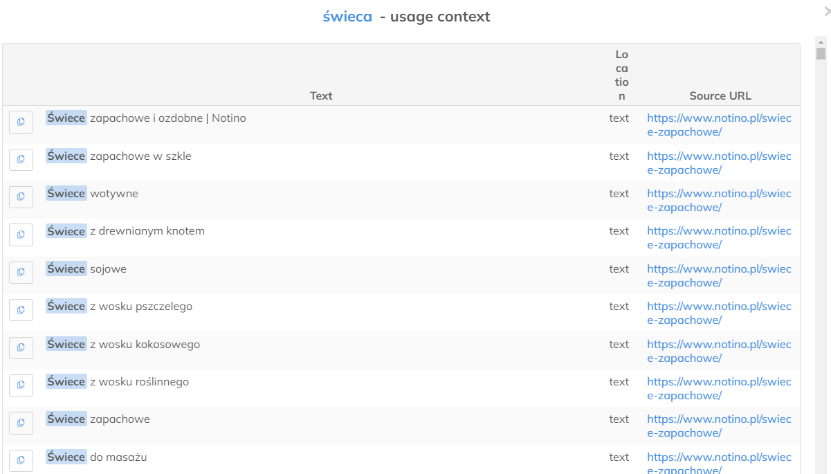 Ciekawą opcją jest również informacja w jaki sposób daną frazę możemy użyć w tekście. Klikamy przykładowo frazę „Świece". Następnie: