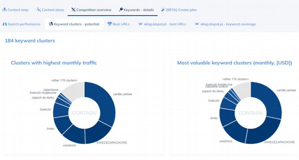 W zakładce „Keyword clusters – potential” możemy sprawdzić potencjał klastrów. Są to widoki przedstawiające: