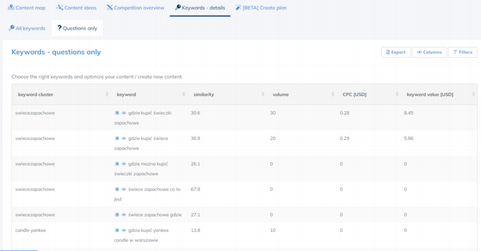 Służy do tego zakładka „Keywords – details”, gdzie wybieramy „Questions only.” Raporty (np. frazy) z narzędzia możemy bardzo łatwo eksportować. Na powyższym widoku w prawej części znajduje się przycisk umożliwiający szybki eksport.
