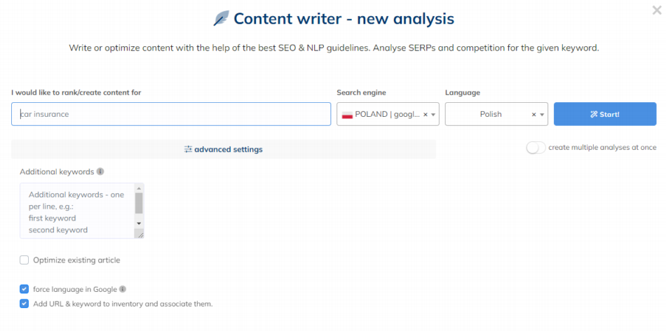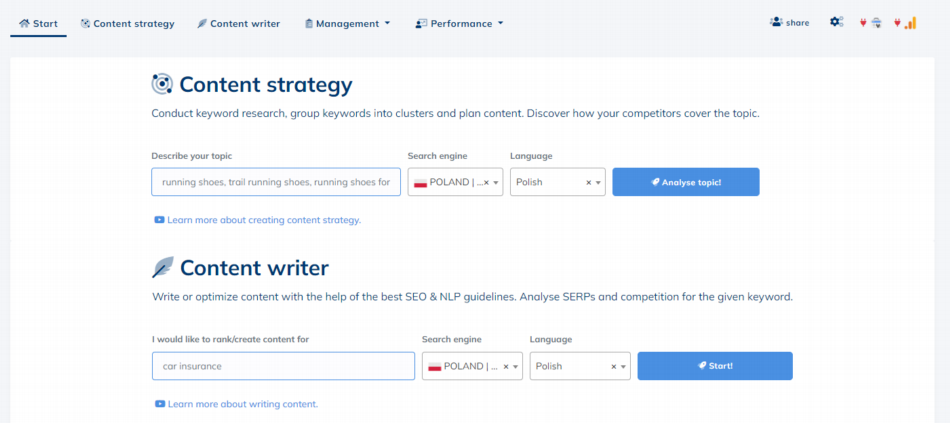 Poniżej przedstawię główne opcje tego dosyć rewolucyjnego narzędzia. Jest to z pewnością jedno z lepszych narzędzi w ostatnich latach, które pojawiło się w świecie SEO. Jeśli miałbym znaleźć odpowiednika lub takie narzędzie, które posiada podobne funkcje będzie to już wyżej wspomniany Surfer (także polskie narzędzie). Pozwala on przykładowo zoptymalizować serwis na podstawie konkurencji czy wyszukać frazy kluczowe.
