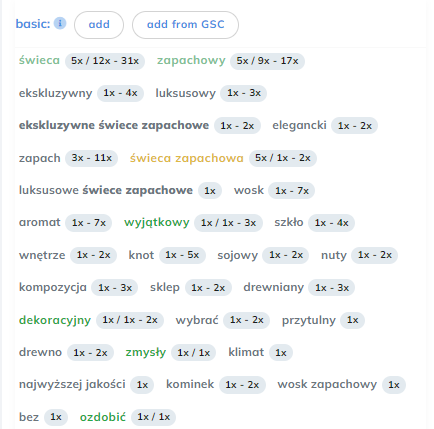 Edytor niezwykle usprawnia tworzenie treści na potrzeby SEO. Jeśli dodamy frazę sugerowaną zostanie ona oznaczona kolorem zielonym. Podana jest także sugerowana ilość powtórzeń danej frazy w naszym tekście.