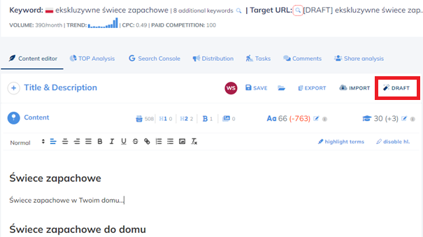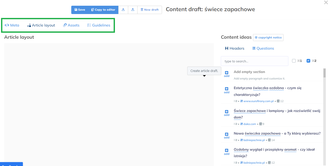 Szybko można utworzyć także „szkielet” naszego artykułu klikając w przycisk DRAFT: