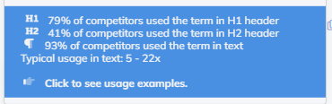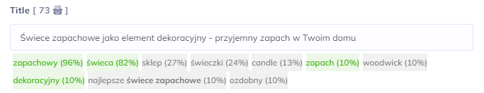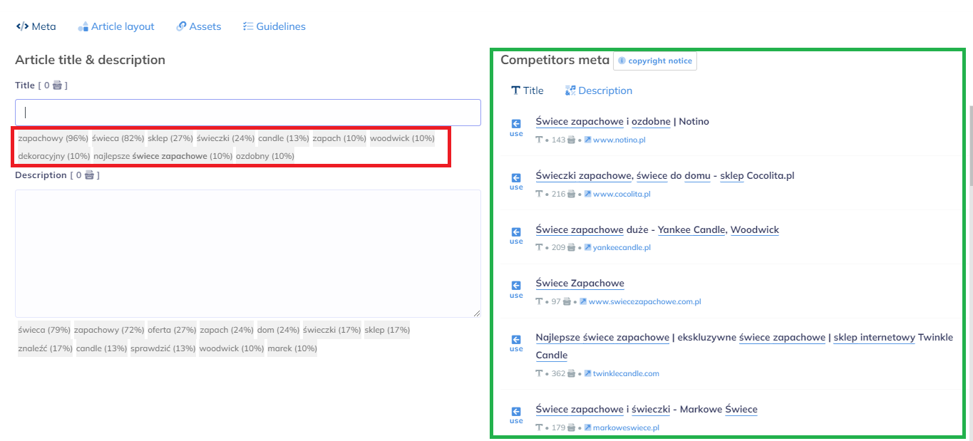 Elementy title i meta description – szybko dostaniemy propozycję dla naszego title oraz description, czyli 2 ważnych elementów SEO (description nie wpływa na ranking, jednak zwiększa znacznie CTR w wynikach). Otrzymamy informacje jakie frazy są często używane (kolor czerwony), a także przykłady, jakie stosowała nasza konkurencja (kolor zielony).