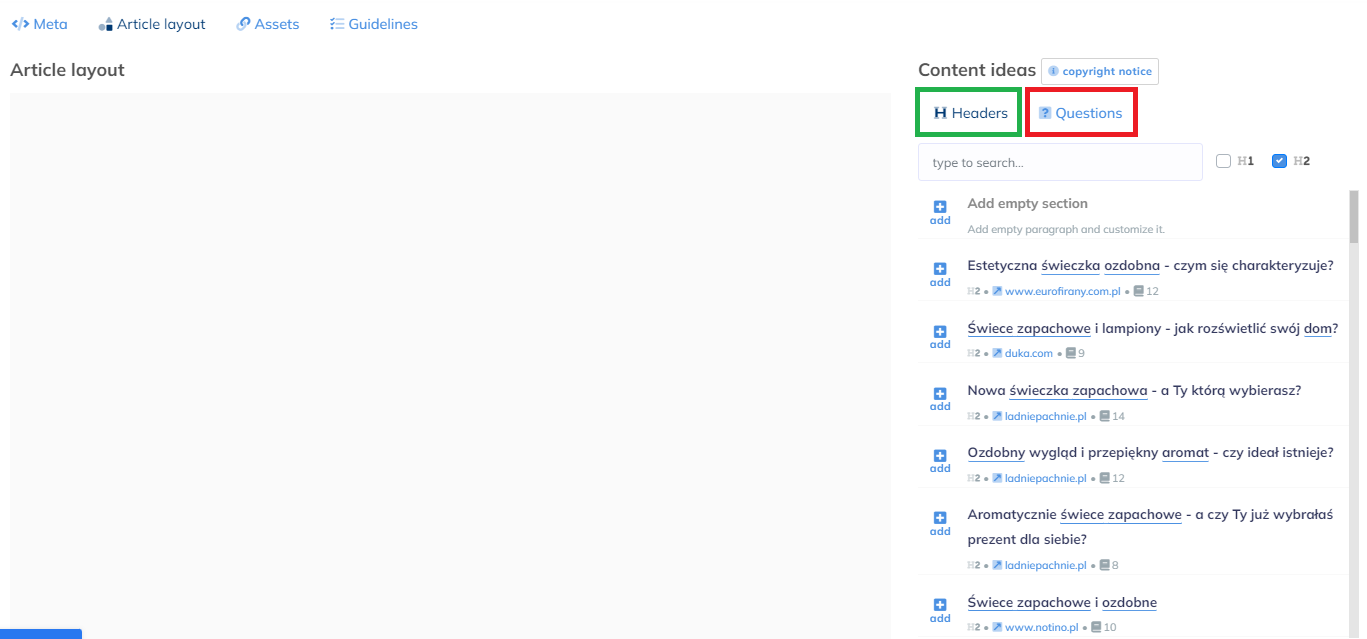 Narzędzie pozwoli nam utworzenie szybkiego szkicu artykułu poprzez dodawanie paragrafów i nagłówków. Znajdują się tam także pytania, które można użyć w treści – kolor czerwony.