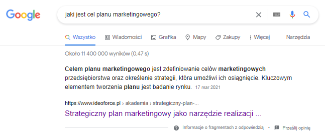 W jaki sposób wyszukiwarka Google jest w stanie określić, że właśnie to zdanie jest odpowiedzią? Kluczowe jest tu zapewne użycia słów „celem” oraz „jest”.