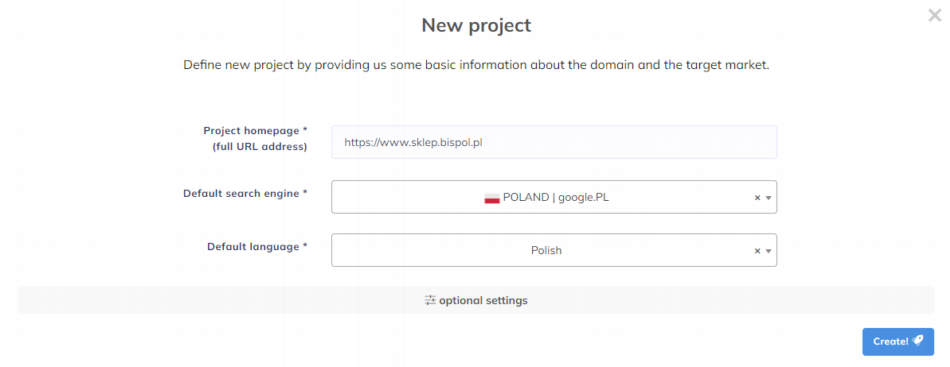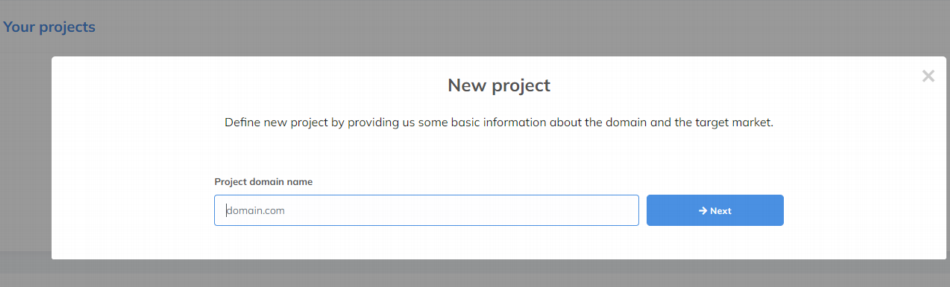 W pierwszym etapie musimy założyć nowy projekt. To bardzo proste. Dodajemy nazwę swojej domeny. Nie trzeba podawać jaka to wersja – czy z „https” czy bez „www” itp., wystarczy w formie nazwadomeny.pl.