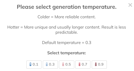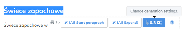 Temperatura odpowiada głównie za długość czy jakość tekstu. Ogólnie mówiąc, jeśli przesuniemy ją bliżej 0, wtedy dostać możemy tekst bardziej ogólny i niekiedy nie unikatowy, natomiast zwiększając otrzymać możemy niezbyt dobry merytorycznie, ale dłuższe. Domyślna wartość to 0.3.
