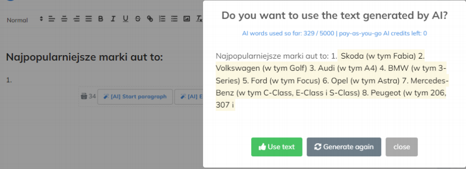 Możemy też zasugerować wylistowanie czy listę numerowaną, wtedy AI będzie starać się dopasowywać treść do naszego schematu: