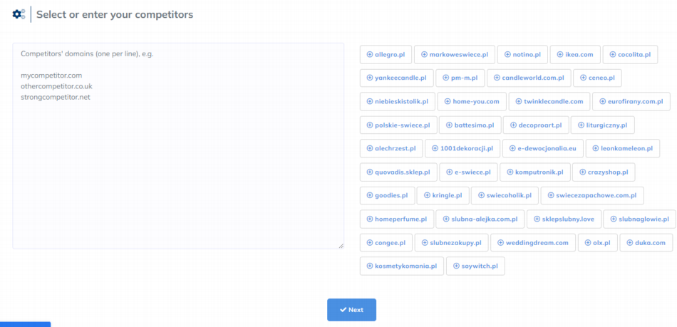 W kolejnym kroku wybieramy konkurencję. Starajmy się (nie tylko w tym narzędziu) szukać naszej bezpośredniej konkurencji. Posiadając mniejszy sklep internetowy nie przyrównujmy się od razu do gigantów jak Ceneo czy Allegro. Najlepiej wybrać najbardziej zbliżone ofertowo/contentowo serwisy.