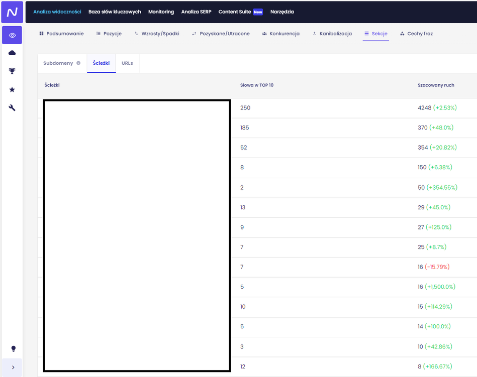 Raport „ Sekcje” – „Ścieżki” („Analiza widoczności) w narzędziu Senuto jednego z naszych klientów e-commerce