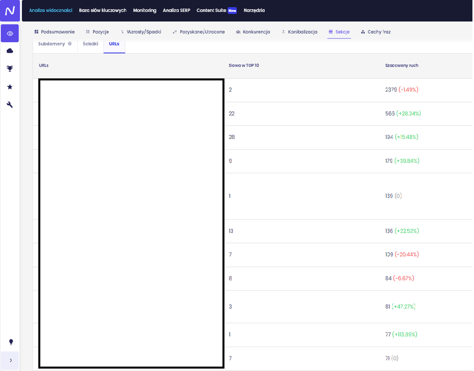 Raport „ Sekcje” – „URL-s” („Analiza widoczności) w narzędziu Senuto jednego z naszych klientów e-commerce