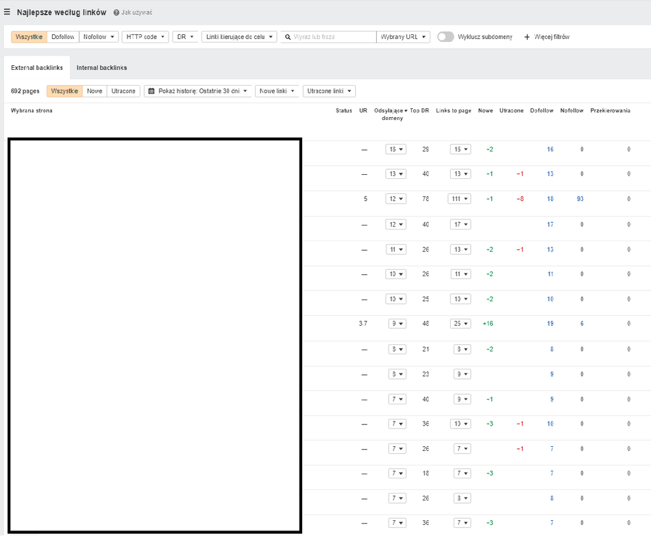 W raporcie „Strony” – „Najlepsze według linków” możemy zobaczyć adresy URL, które generują parametry z potencjałem w zakresie ilości linków przychodzących w ramach konkretnej podstrony. Takie miejsca mogą zdobywać duże zainteresowanie wśród Googlebotów, a co za tym idzie, przekazywać/kierować moc dalej, w głąb witryny.