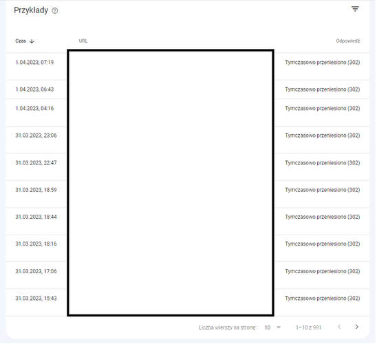 Zrzut ekranu raportu „Żądania indeksowania: Tymczasowo przeniesiono (302)” jednego z naszych klientów e-commerce