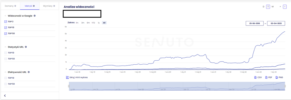 Senuto jest narzędziem, które pozwala monitorować widoczność danych podstron w bezpłatnych wynikach wyszukiwania. Dzięki niemu wiemy np. które adresy URL są topowe. Innymi słowy mówimy tutaj o puli fraz kluczowych i ich pozycjach, jakie osiągają w TOP10, TOP20 i TOP50 organicznych wyników wyszukiwania.