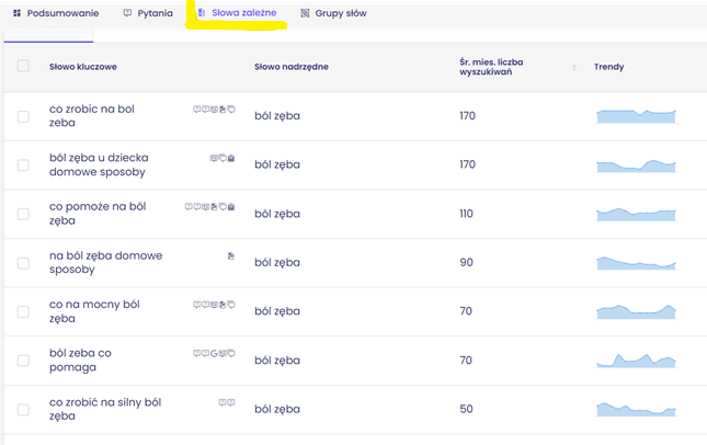 W zakładce „Słowa zależne” można z kolei sprawdzić zapytania, związane z wybranym słowem kluczowym. Zapytania te są tworzone na podstawie algorytmu Google Suggest, który generuje popularne i często wyszukiwane zapytania, związane z danym słowem kluczowym. Dzięki analizie słów zależnych można w łatwy sposób zidentyfikować interesujące tematy powiązane, które warto opisać na blogu.