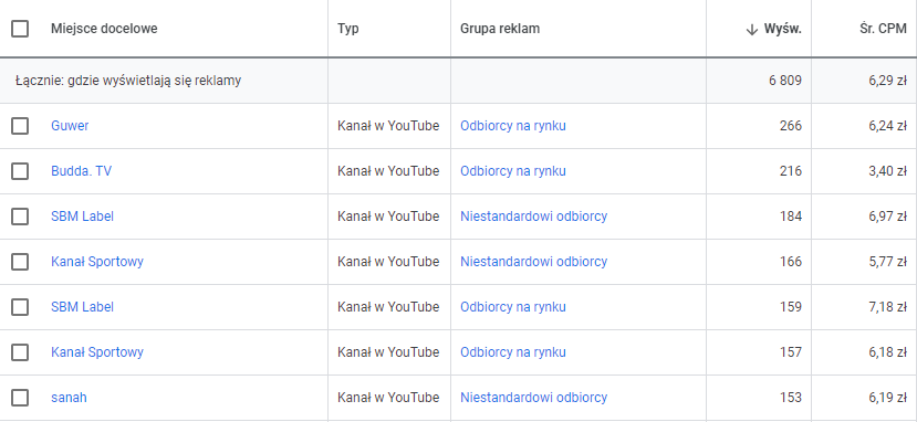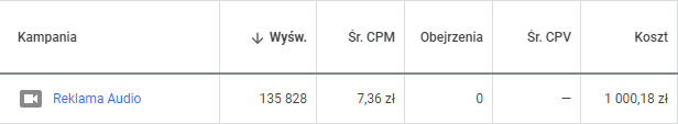 Jak już wspominałem, statystyka „Obejrzenia” jest całkowicie nieistotna dla reklamy audio. Jest to spora różnica w stosunku do innych typów reklamy na YouTube, gdzie obejrzenia stanowią jeden z głównych sposobów weryfikacji wyników. W przypadku kampanii audio musimy natomiast skoncentrować się na wyświetleniach i CPM. W czasie naszej próbnej kampanii udało nam się uzyskać CPM równy 7,36 zł. Za pojedyncze wyemitowanie reklamy zapłaciliśmy więc ok. 0,007 zł. Jest to wynik lepszy niż w przypadku większości naszych reklam typu In-Strem i Bumper Adsów, gdzie stawki CPM wahały się w granicach 9-12 zł. Oczywiście wiele zależy tutaj od wybranej grupy docelowej, dla których stawki mogą różnić się dość znacząco. Przypuszczam, że wyniki reklamy mogły być jeszcze lepsze, gdyby naszym targetem byli np. „wszyscy użytkownicy YouTube, którzy mają uszy”.