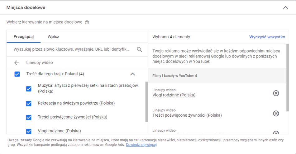 Możliwości jest tutaj sporo i pozwalają one na dotarcie do wyselekcjonowanej grupy osób, których może zainteresować nasza oferta. Nie spotkałem się jednak z żadnymi nowymi możliwościami, które dostępne byłyby wyłącznie dla reklamy audio. Największą nowością są tutaj tzw. Lineupy wideo, pozwalające pokazywać nasze reklamy przy filmach z wyselekcjonowanych, popularnych w danym kraju kategorii. Na chwilę obecną opcje dla naszego kraju nie są jednak szczególnie rozbudowane.