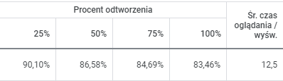 W tej kategorii nasza reklama poradziła sobie bardzo dobrze. W 100% obejrzało ją ok. 83% widzów, co jest wynikiem dużo lepszym, niż w przypadku standardowej reklamy In-stream. Natomiast średni czas odtwarzania 15-sekundowego filmu kształtował się w granicach 12,5 sekundy.