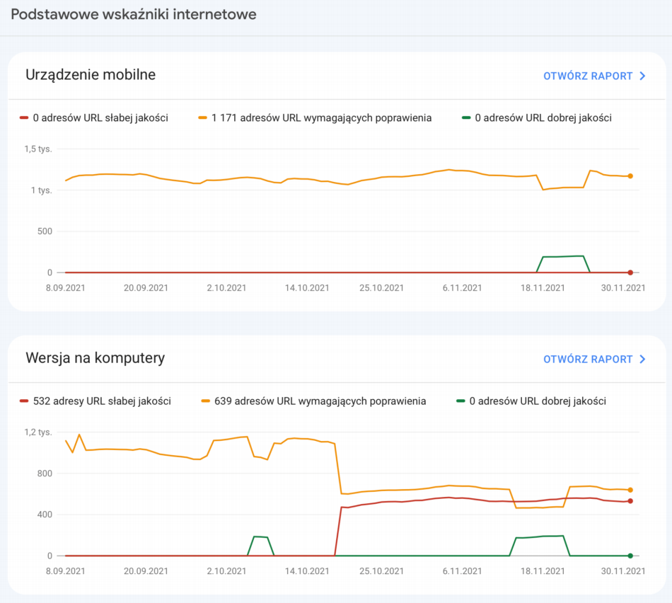 Wykresy prezentują nam liczbowe dane na osi czasu, ile podstron analizowanego serwisu podlega poszczególnym ocenom. Narzędzie to również pozwala na łatwe zobrazowanie, jak serwis reaguje w czasie na wdrożone zmiany optymalizacyjne oraz informuje o zaistniałych problemach.