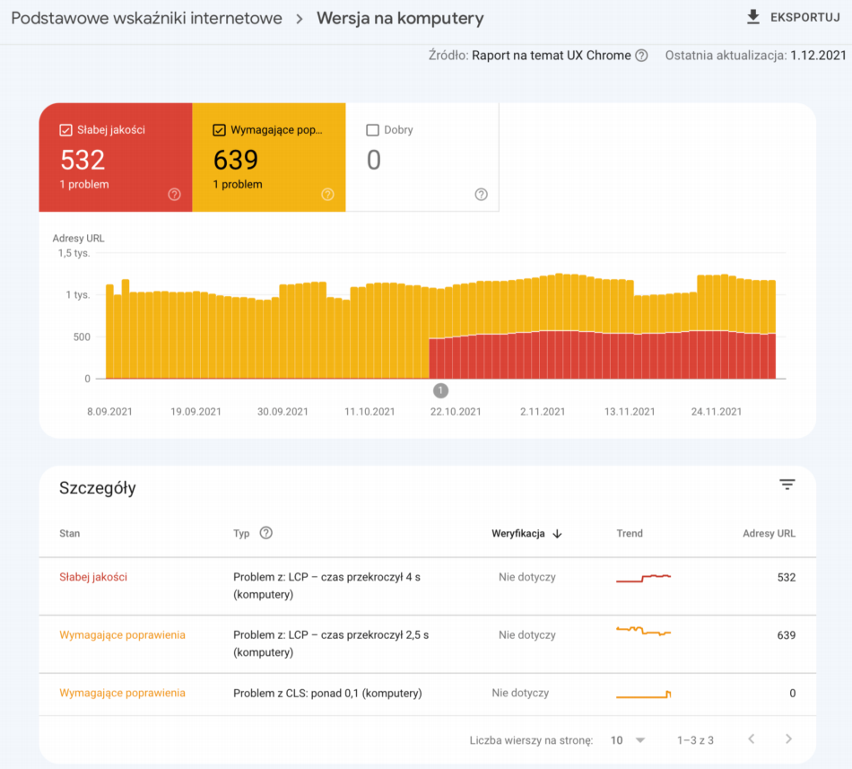 W narzędziu mamy dostęp do informacji, z jakimi problemami boryka się nasz serwis, w jakiej ilości oraz jak bardzo duży jest to problem. W szczegółach znajdziemy informację czego dokładnie dotyczy problem - np. „Problem z: LCP – czas przekroczył 4 s (komputery)”. Po kliknięciu w daną pozycję zobaczymy na osi czasu liczbę problematycznych podstron oraz jej wzrost/spadek na przestrzeni czasu. Poniżej zaś znajduje się ich lista.