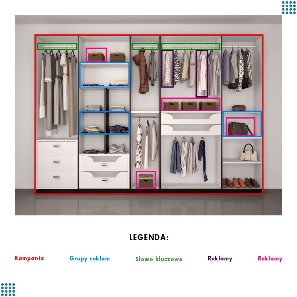 Struktura konta reklamowego składa się z czterech elementów: kampanii, grupy reklam, słów kluczowych i reklamy. Można przyrównać je do szafy. Wyobraźmy sobie szafę, która składa się z półek i organizerów na poszczególne ubrania. I tak - szafa będzie kampanią, w której będzie można zorganizować reklamy (ubrania), porządkując je na konkretnych półkach (grupy reklam) i organizerach (słowa kluczowe).